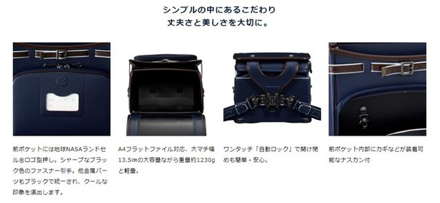 ■その他:伸びる小マチが特徴。おしゃれなKマークカブセカシメ。前ポケットに地球NASAランドセルロゴ。