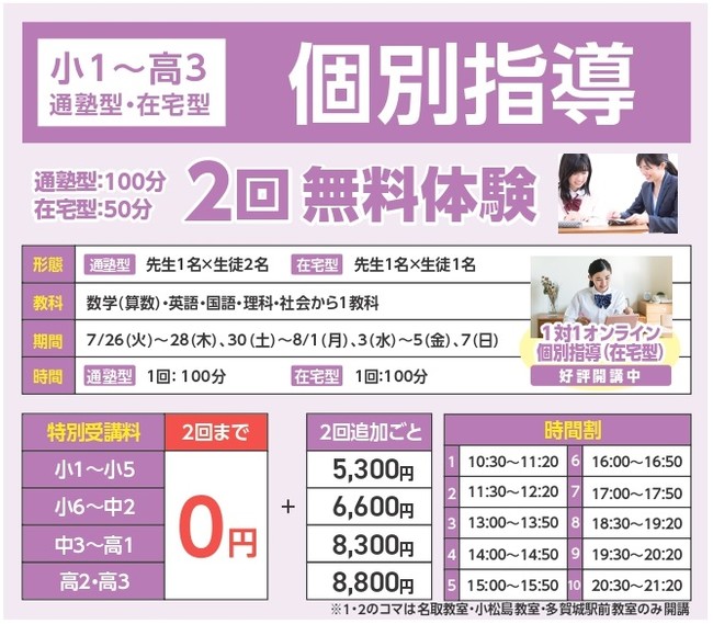夏期講習2講座を無料招待いたします。復習~先取りまで一人ひとりの要望に応じて指導いたします。要望は事前カウンセリングにて聞き取りさせていただきますので、ご希望の場合はお早めに下記よりお申し込み下さい。また、すぐに体験したい場合は通常指導も1講座無料体験できます。ご相談下さい。尚、各時間帯、定員に到達次第募集終了となりますので、早めのお問合せ・お申込みをお勧めいたします。