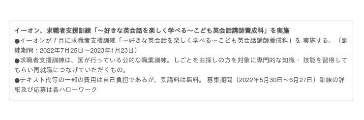 イーオンのプログラムである『~好きな英語を楽しく学べる~こども英会話講師養成科』は、厚生労働省所管の独立行政法人である「独立行政法人 高齢・障害・求職者雇用支援機構」より「求職者支援訓練」に認定されました。
