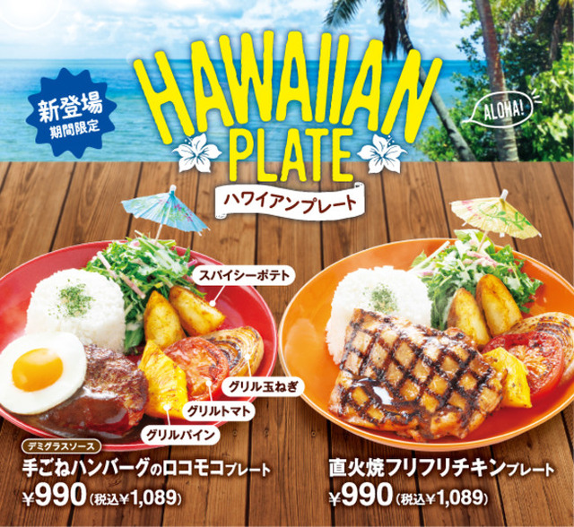 ビッグボーイでは、自慢の手ごねハンバーグや直火焼グリルチキンにお替り自由のサラダバーやスープバーがついたお得なプレートメニューを、お手頃価格でご用意しています。今回は、日本にいながらハワイ気分を味わえる「ハワイアンプレート」が登場します。ハワイの定番料理である“ロコモコ”と、甘辛いソースをつけたチキンを直火で焼くローカルフード“フリフリチキン”を、ビッグボーイ風にアレンジしました。今年の夏はビッグボーイへ“ハワイ旅行”にお越しください。