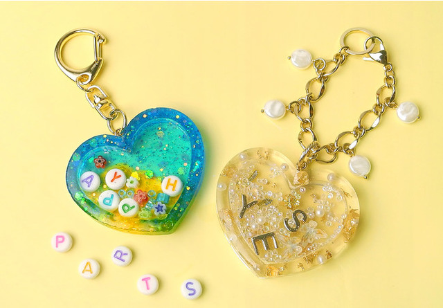 レジン液を型に入れて作る、かわいいハート型のアクセサリーをお作りいただけます。