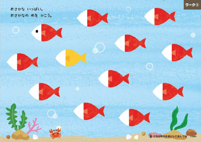 クレヨンやペンでお魚の目を描くことでおえかきのスタートである「点描(てんびょう)」を体験し、おえかきの楽しさを感じます。