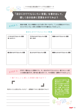そして、ママの自己肯定感がアップするワークとして「自分にかけてもらいたい言葉を書き出して、優しく自分自身に言葉をかけてみよう」という書き込み式のワークを紹介しています。