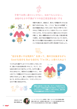 特集記事「ママの笑顔が赤ちゃんの幸せ! 自己肯定感をはぐくむ親子の言葉がけ」では、子育て期間は、赤ちゃんが寝てくれない、食べてくれないといった“思い通りにいかない毎日”の連続であることや、育児をがんばったからといってほめてもらえないことでママが孤独感や焦りを感じ、自己肯定感が低くなりやすい時期であることをお話ししています。