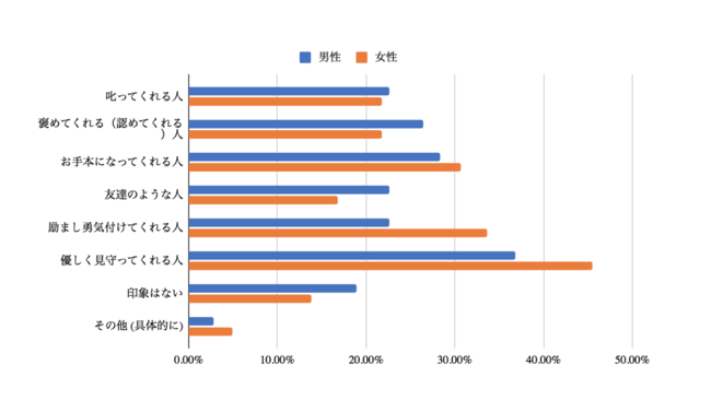 「お父さんの存在」と「お母さんの存在」を比較したところ、それほど顕著な差はありませんでしたが、「お母さんの存在」の方が、「褒めてくれる(認めてくれる)人」「友達のような人」の回答が多い結果となりました。逆に「お父さんの存在」に多かったのは、「お手本になってくれる人」「印象はない」という結果でした。