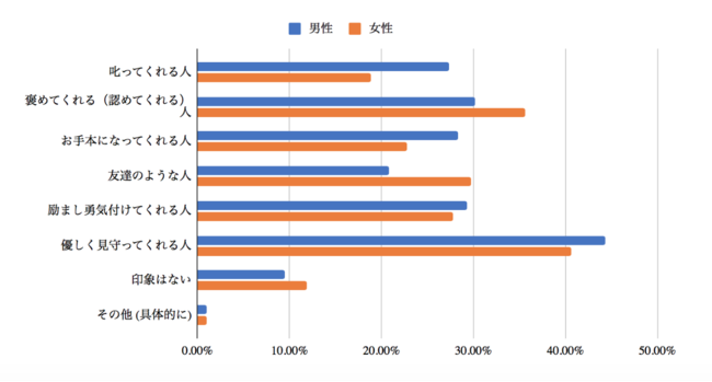 次に多かった回答は、「お父さんの存在」では「お手本になってくれる人」、「お母さんの存在」では「褒めてくれる(認めてくれる)人」でした。