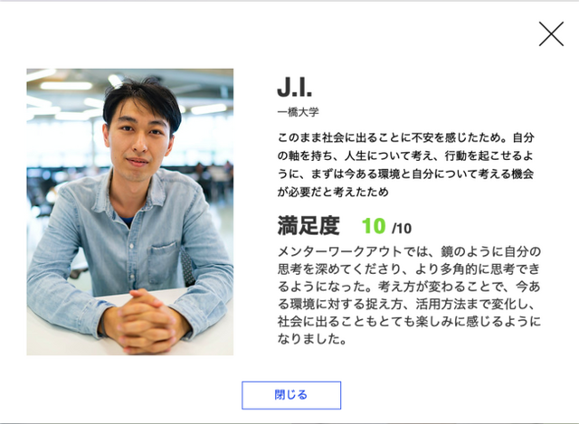 メンターワークアウトでは、鏡のように自分の思考を深めてくださり、より多角的に思考できるようになった。考え方が変わることで、今ある環境に対する捉え方、活用方法まで変化し、社会に出ることもとても楽しみに感じるようになりました。