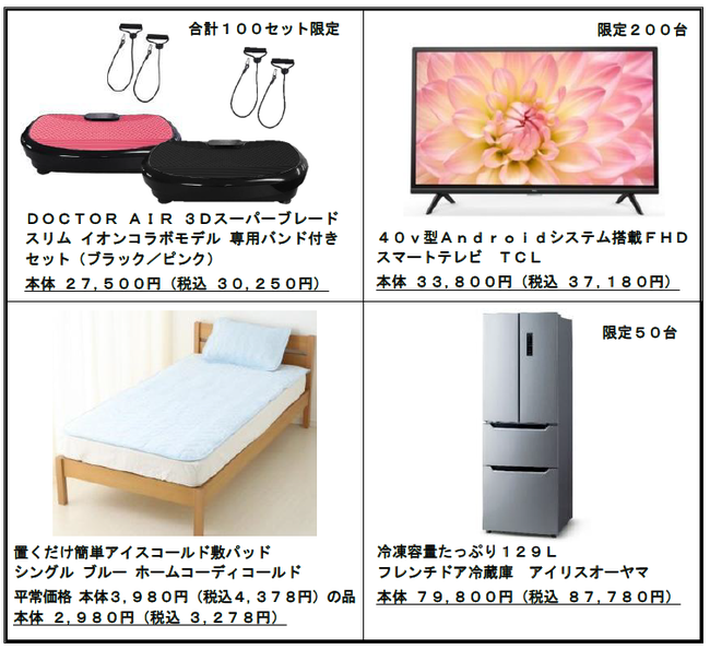 初回は「夏のボーナス先取り」をコンセプトに、“お出かけ準備品”の「バッグ」や「抱っこ紐セット」のほか“イエナカ時間”を充実させる「フィットネスグッズ」や「スマートテレビ」などの商品も取り揃えます。