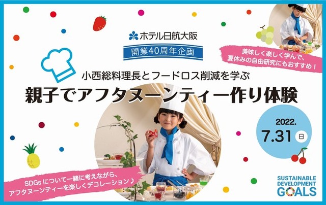 大阪 心斎橋のホテル日航大阪(大阪市中央区西心斎橋1-3-3、代表取締役社長・総支配人:呉服 弘晶)は、本年9月4日に迎える開業40周年を記念し、「誰かを笑顔にできること」をテーマにさまざまな企画を展開しています。その一つとして、『小西総料理長とフードロス削減を学ぶ~親子でアフタヌーンティー作り体験~』を2022年7月31日(日)に開催いたします。