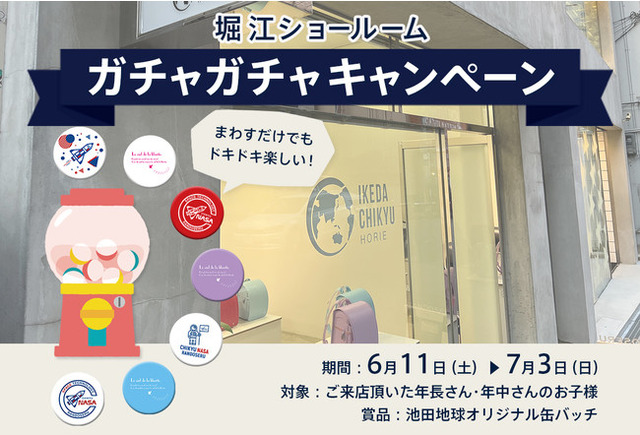 ランドセルの企画・販売を行う池田地球株式会社(本店:東京都港区:代表取締役 村尾光一)が9月末迄のポップアップストアとして運営する大阪・南堀江の「池田地球 堀江ショールーム」にて、ご来店いただいたお客様限定(年長さん・年中さん対象/※おひとり様1回限り)に『地球NASAランドセル(R)』のオリジナル缶バッチをカプセルにした『ガチャガチャキャンペーン』を6/11(土)~7/3(日)の期間限定で実施いたします。何の缶バッチがでるかは時の運!お子さまに“ドキドキわくわく”を楽しんでいただく企画です。中には『当たり』もご用意しております(現地発表)のでどうぞお楽しみに!