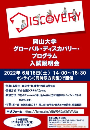 国立大学法人岡山大学(本部:岡山市北区津島中、学長:槇野博史)のグローバル・ディスカバリー・プログラム(GDP)では、高校生・既卒者と保護者・教員の皆様を対象として、2022年6月18日(土)14:00~16:30にオンライン(同時双方向型)での入試説明会を開催します。