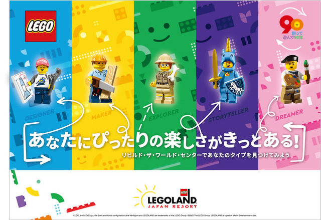 『あなたにぴったりの楽しさがきっとある!』では、思いのままレゴ ブロックを組み立てて、くずして、また組み立てるというプロセスを通じて子どもたちの創造力を引き出し、自分だけの自由な世界を“リビルド”できるという考え方を遊びの中から学ぶワークショップです。参加者は専用チャートを用いて5つのタイプ(デザイナー/メーカー/エクスプローラー/ストーリーテラー/ドリーマー)に診断され、それぞれ作品作りのヒントが書かれたアイデアカードでインスピレーションを受けながら、自分にぴったりの遊び方や楽しさを発見していただきます。今回、スペシャルな試みとして、レゴグループから5つのタイプをマスターした称号を持つ人物“マスタープレイヤー”が限定登場し、子どもたちにいつもよりも楽しいビルド体験をお届けするほか、各タイプのポップバッジとレゴグループ90周年限定オリジナルネックストラップをプレゼント。完成作品は巨大な地球儀「レゴランド・プラネット」に飾って写真撮影していただき、期間中、ツイッターでハッシュタグ「#LEGO90years」「#レゴランド」「#(診断された) タイプ」をつけて作品写真を投稿していただくと、抽選や審査により、公式サイトでの紹介やプレゼントが当たるキャンペーンも実施します。