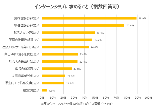 インターンシップに求めることは、「業界理解を深めたい」が88.9%で最多。次いで「職種理解を深めたい」77.4%、「就活ノウハウを得たい」49.4%、「実際の仕事を体験したい」47.2%が続きました。「活躍できる企業に就職するために、業界や職種への理解を深めたい」「業界や職種の理解が深まれば、志望理由に説得力を持たせることができると思う」「業界や仕事内容の理解を深めることで、就職活動を有利に進めたい」などの声が上がりました。