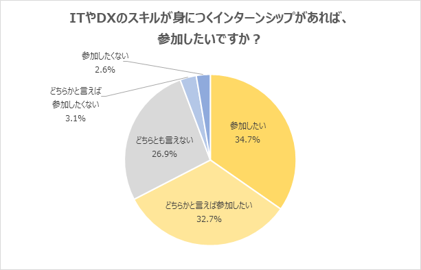 ITやDXが身につくインターンシップについて、「参加したい」と回答した学生が34.7%に上りました。「どちらかと言えば参加したい」32.7%を合わせると、約7割の学生がITやDXのスキルが身につくインターンシップへの参加を希望していることが分かります。「どの業界、どの職種でも必須のスキルだと思う」「今後求められるスキルだと思うので、身に付けておきたい」などの声が寄せられました。
