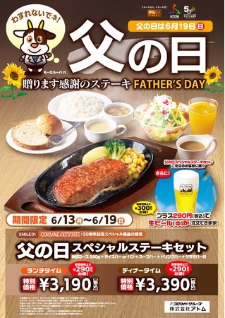 コロワイドグループの株式会社アトム(本社:神奈川県横浜市、代表取締役社長:山角豪)は、2022年1月14日(金)に設立50周年を迎え新たに設定した「おいしい!たのしい!うれしい!」ACTIONの一環として、「ステーキ宮」各店で、2022年6月13日(月)~6月19日(日)までの7日間、「父の日スペシャルステーキセット」として「宮ロース240g+フルセット付」でランチ3,190円(税込)、ディナー3,390円(税込)と通常よりも290円(税込)お得な価格で提供いたします。