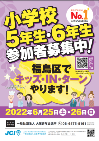 大阪に住む経営者層およそ800人以上で構成され、大阪のまちのために70年間以上活動し続ける、一般社団法人大阪青年会議所(所在地:大阪府大阪市港区、理事長:梶本秀則)は、 福島区の小学5年生~6年生(男女)の100名を対象に子どもが社会の仕組みを体験出来る「キッズ・IN・ターン」を2022年6月25日(土)~26日(日)に福島区内の企業や店舗等で開催致します。