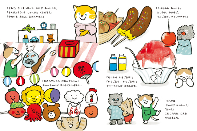 「金魚すくい!射的とくじびき!」「屋台もあるよ」「おめんやさん!」