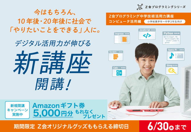 このたび、小学校高学年~中学3年生向けに自分専用のコンピュータを使ってデジタル活用力を身につける12カ月講座「Z会プログラミング中学技術活用力講座 コンピュータ活用編」を開講した記念に、期間限定で「新規開講記念キャンペーン」としてAmazonギフト券5,000円分プレゼントを実施中!お得に新講座を始めるチャンスです。