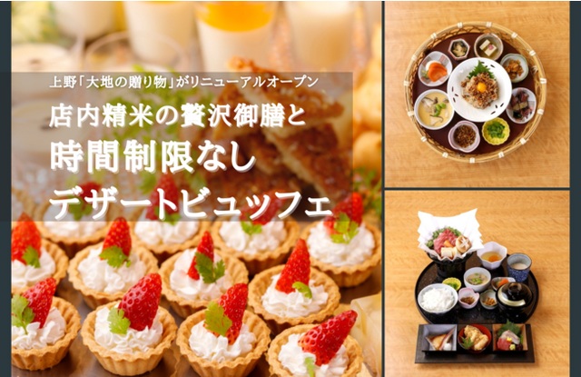 株式会社DDホールディングスの連結子会社である株式会社ダイヤモンドダイニング(本社:東京都港区、代表取締役社長:松村厚久)が運営する「大地の贈り物」は、全メニュー一新し「贅沢御膳とデザートビュッフェ」の和食レストランとしてリニューアルオープンいたしましたので、下記のとおり、お知らせいたします。