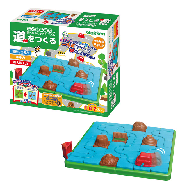「ぜったいに教えない!」がモットーで、伝説の算数教室と言われている宮本算数教室の宮本先生とともにパズル玩具を開発。「面白い問題だけが子どもを夢中にさせる」という独自のメソッドから、教室でも人気のパズル問題を採用。「動く車」「ライトや鏡」といった楽しいパーツを用いることでゲーム感覚で夢中になって遊べます。遊びながら自分で考える力を育み、目に見える「できた!」が達成感や自信になり楽しくやる気を引き出す知育玩具です。