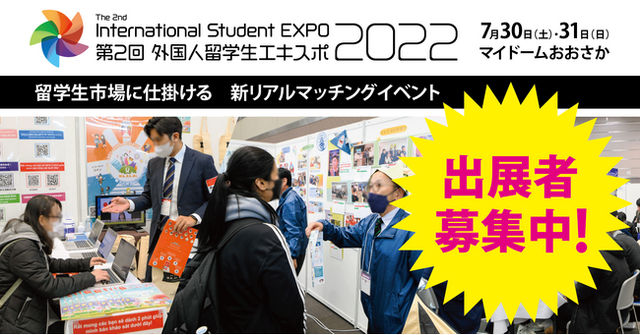 外国人留学生エキスポ実行委員会は、2022年7月30日(土)~7月31日(日)に、外国人留学生のお悩み解決・国際交流をテーマとした、「外国人留学生エキスポ(International Student EXPO)」をマイドームおおさかにて開催します。