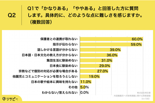 Q1で「かなりある」「ややある」と回答した方に、「Q2.具体的に、どのような点に難しさを感じますか。(複数回答)」(n=100)と質問したところ、「保護者との連携が取れない」が60.0%、「指示が伝わらない」が59.0%、「話しかける言語が分からない」が39.0%という回答となりました。
