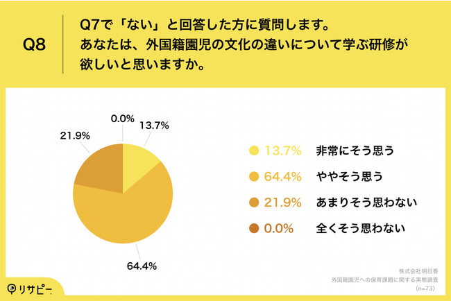 Q7で「ない」と回答した方に、「Q8.あなたは、外国籍園児の文化の違いについて学ぶ研修が欲しいと思いますか。」(n=73)と質問したところ、「非常にそう思う」が13.7%、「ややそう思う」が64.4%という回答となりました。