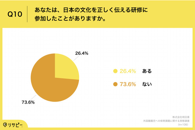 「Q10.あなたは、日本の文化を正しく伝える研修に参加したことがありますか。」(n=106)と質問したところ、「ある」が26.4%、「ない」が73.6%という回答となりました。