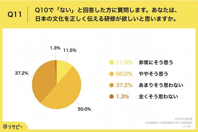 Q10で「ない」と回答した方に、「Q11.あなたは、日本の文化を正しく伝える研修が欲しいと思いますか。」(n=78)と質問したところ、「非常にそう思う」が11.5%、「ややそう思う」が50.0%という回答となりました。