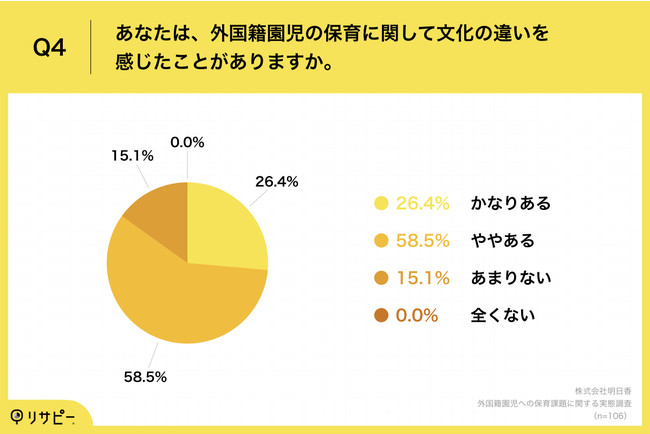 「Q4.あなたは、外国籍園児の保育に関して文化の違いを感じたことがありますか。」(n=106)と質問したところ、「かなりある」が26.4%、「ややある」が58.5%という回答となりました。