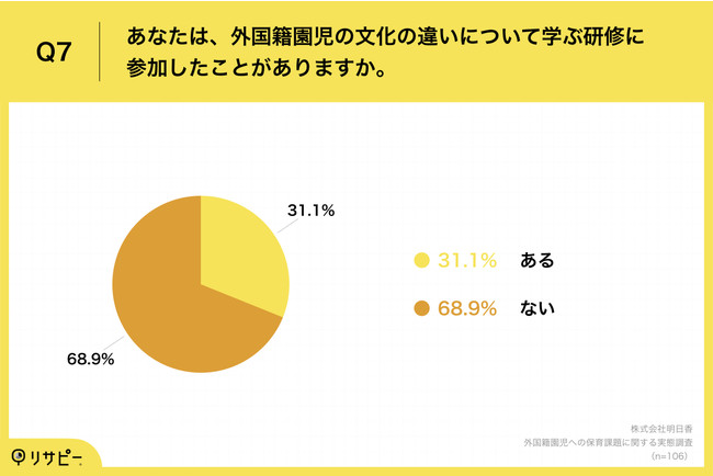 「Q7.あなたは、外国籍園児の文化の違いについて学ぶ研修に参加したことがありますか。」(n=106)と質問したところ、「ある」が31.1%、「ない」が68.9%という回答となりました。