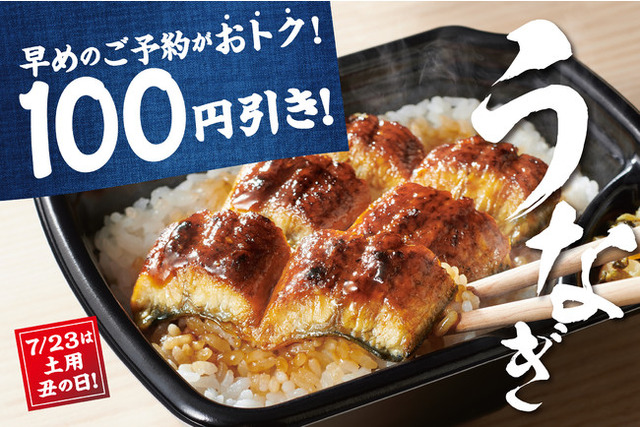 6月23日(木)より7月18日(月)の期間に、店頭や予約サイトよりご予約いただくと、7月23日(土)の土用丑の日を含む3日間限定で『うな重』『上・うな重』を100円引きでご購入いただけます。また、うな重と豚汁や旨塩スープを組み合わせたセットメニューも予約割引の対象です。最大240円引きで購入できるお得なチャンスをぜひご利用ください。