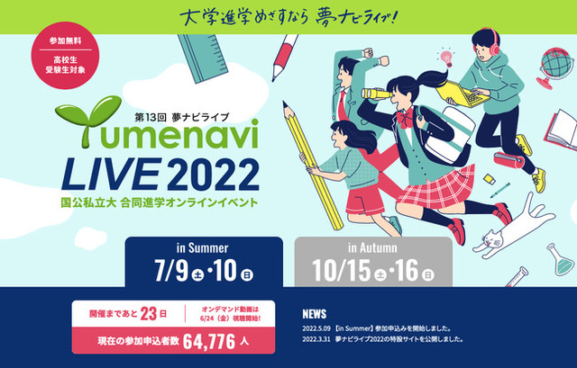 株式会社フロムページ(本社:大阪府大阪市)はコロナ感染対策により普及し始めたオンラインの魅力を活かして、全国274の国公私立大学が一堂に会する進学イベント「夢ナビライブ2022 in Summer」を開催します。