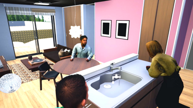 その点、「バーチャルモデルハウス」は、ジブンハウスの規格住宅をCGで再現し、時間を気にすることなく心ゆくまで、家の中を見て回ることができます。また、壁紙を変えて部屋の雰囲気を変えたり、コンロの火を付ける、引き出しを開ける、水道を使う、天気や時刻を変更するなど、リアルな住宅展示場では体験できないような様々なシチュエーションを試すことが可能です。現実空間での制約から自由になれるだけでなく、「自分らしい暮らし方」を、複数人の家族のアバターで疑似体験しながら、理想の家づくりができる。それが「バーチャルモデルハウス」です。