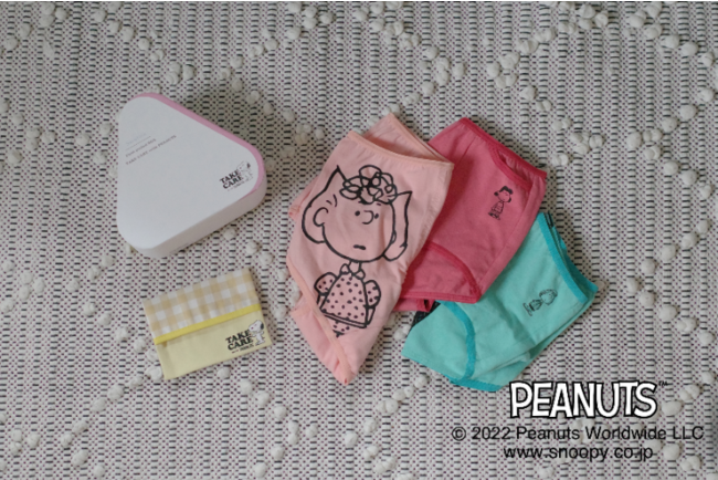 カラフルなショーツにピーナッツの仲間たちがプリントされた可愛らしいセットで、はじめて生理を迎えた時の不安な気持ちに寄り添います。