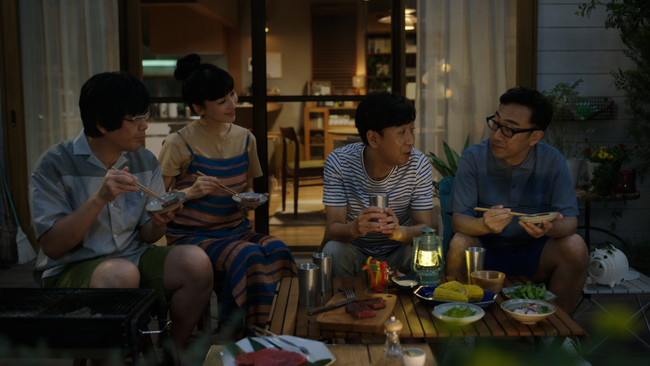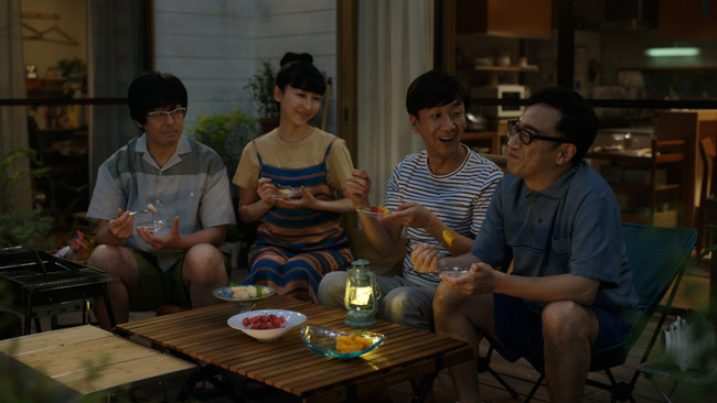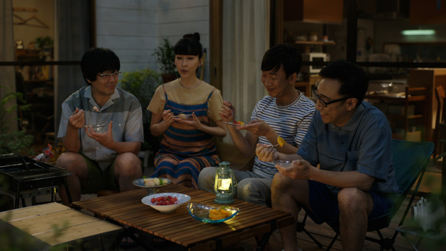 和やかな雰囲気で現場入りした4名。全員セリフや流れがしっかり頭に入っているようで、まるでプライベートの友人と集まったような自然な雰囲気で撮影がスタートしました。出演者、撮影主要スタッフが昨年のメンバーと同じこともあり、スタッフとのやり取りもスムーズで一体感が強く、笑いが溢れ和気あいあいとした雰囲気で撮影が進みます。「セットの料理がおいしい」と盛り上がるなか、お肉を焼く豊本さん。「豊本だけ3枚も!」と他の方よりお肉が多いことに気が付いた飯塚さんの声に笑いが起こり、「お肉の主だからね~」と妻役を演じている麻生さんの優しい返しが聞こえ、撮影は終始和やかな様子でした。
