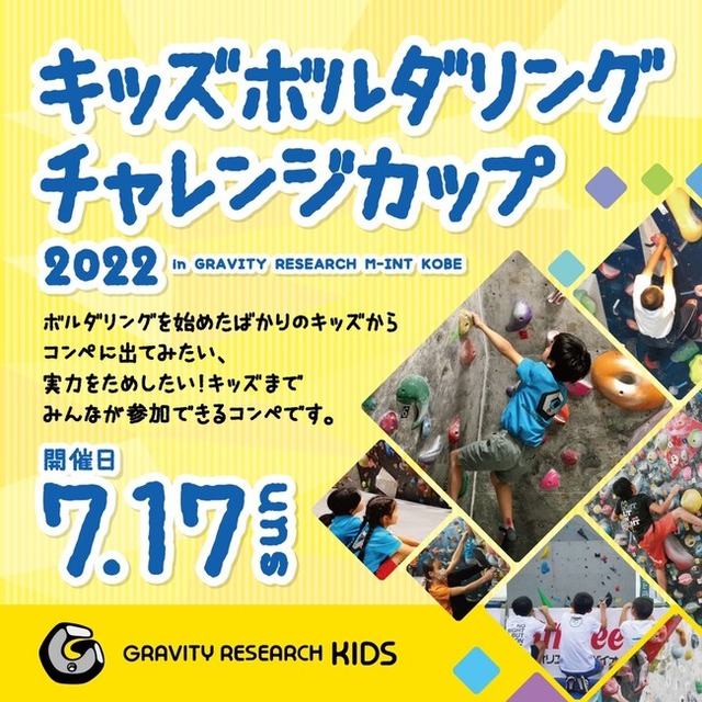 グラビティリサーチ(以下GR)では、キッズを対象としたボルダリング大会を定期的に開催し、毎回好評を頂いております。この度、天空のクライミングジムとして多くのお客様にご愛顧頂いているGRミント神戸では初となる「キッズボルダリングチャレンジカップ 2022」を開催します。キッズの年代に合わせたカテゴリークラスを準備し、頂点を目指し同年代のライバル達と戦略、バランス、テクニックを競います。会場は屋外スペースで、参加者・観覧者ともに新型コロナウイルス感染拡大防止対策を徹底して開催します。