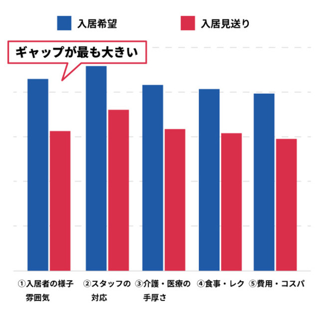 入居を希望した方と入居を見送った方とで、満足度に最もギャップが出た項目は「入居者の様子・施設の雰囲気」となりました。