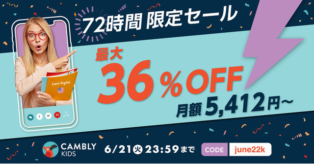 Cambly Inc.(本社:アメリカ・サンフランシスコ、日本代表:佐藤 亜希子)が提供する子ども向けオンライン英会話サービス「Cambly Kids(キャンブリー キッズ)」は、 6月19日(日)から6月21日(火)の3日間、Cambly Kids全レッスンプランを15~36%OFFでご利用いただける「72時間限定セール」を開催いたします。