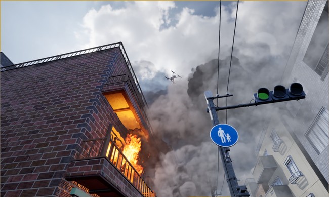 VFR・理経が開発したVRシミュレータは、国産ドローン「SOTEN」と同様のユーザインターフェースを再現し、バーチャル上での飛行訓練を可能にするSOTEN訓練トレーナーです。火事の現場など、再現が困難な実務を模した環境での訓練が積めるため、実務ならではのヒヤリハット(※1)やトラブルの経験が得られます。SOTENと同様の機体性能やユーザインターフェースを再現しているため、カメラ撮影などもトレーナー内で訓練することができ、課題となっている操縦経験の向上にも役立ちます。