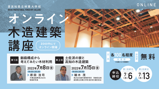 建築家・隈研吾氏が校長を務める高知県立林業大学校(高知県香美市)は、木造建築について学ぶオンライン講座(主催:高知県立林業大学校、後援:公益社団法人日本建築士会連合会 / 公益社団法人経済同友会〈予定〉/ 木材利用推進全国会議〈予定〉)を開催いたします。昨年も好評いただいたオンライン開催にて、今年も講座を実施する運びとなりました。各回異なるテーマ・講師による、全3回の公開講義です。