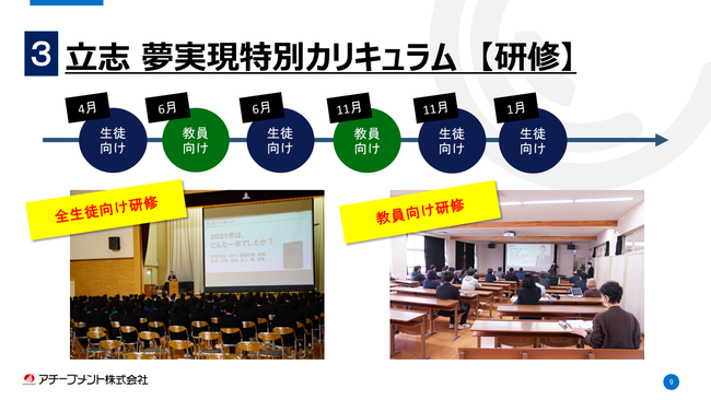 約10年前、大谷選手在籍時にアチーブメントがお届けした『花巻東硬式野球部向けのチームビルディング研修』がカリキュラムスタートのきっかけとなりました。「野球部をもっと強いチームにしていきたい」という佐々木洋監督の思いからスタートをしました。気合根性で目標達成を目指すのではなく、自分が目指す理想像を具体化し、そこからの逆算を徹底的に行い日々の行動を管理していくこと。まさに大谷翔平選手を世界のトッププレーヤーへと成長させたメソッドが花巻東高校にはありました。そのメソッドを、社会人教育で30年以上の経験をもつアチーブメントが提供する「目標達成の技術」とかけ合わせて作り出されたのが、花巻東高等学校オリジナルの『立志 夢実現特別カリキュラム』でした。2019年から全校生徒で取り組みをし始めており、今年で4年目です。2022年4月に入学をした新入生のうち、65.8%は「このカリキュラムがあったから花巻東高校を選んだ」とお答えいただいている、同校を代表するカリキュラムにまで成長をしてきました。