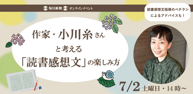 毎日新聞社(代表取締役社長執行役員:松木健)は7月2日(土)午後2時から、スペシャルトークイベント「作家・小川糸さんと考える『読書感想文』の楽しみ方」を開催します。デビュー作「食堂かたつむり」がベストセラーとなった小川さんが、中学時代に書いた感想文を元に、読書感想文指導のベテラン・博田かおり先生と一緒に、感想を文章にしていくプロセスを解き明かします。会場とオンラインの2種類の視聴方法があります。「読書は好きだけど、書くとなったらさっぱり」。そう感じている大人も、夏休みの宿題で取り組む生徒も、楽しくヒントを探ってみませんか?