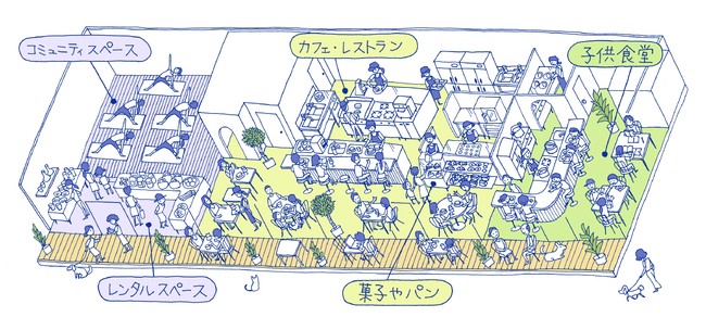 マンション1階部分の空きテナント4室分を利用し、SUNNY food works、キッチンモイ(子ども食堂)、さらにはコミュニティスペース「レンタルスペースパイッカ」も併せて新たに設立。