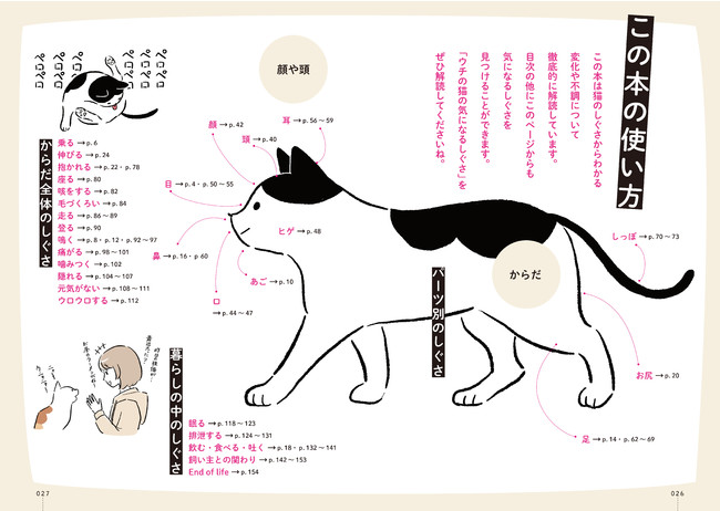 耳や尻尾の動き、鼻の濡れ方、前足モミモミや毛づくろいなど、猫ならではのさまざまなしぐさの中から、飼い主が心配を抱きがちな「しぐさ」60項目超を厳選して掲載。