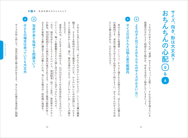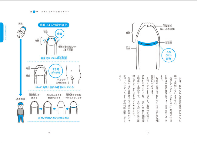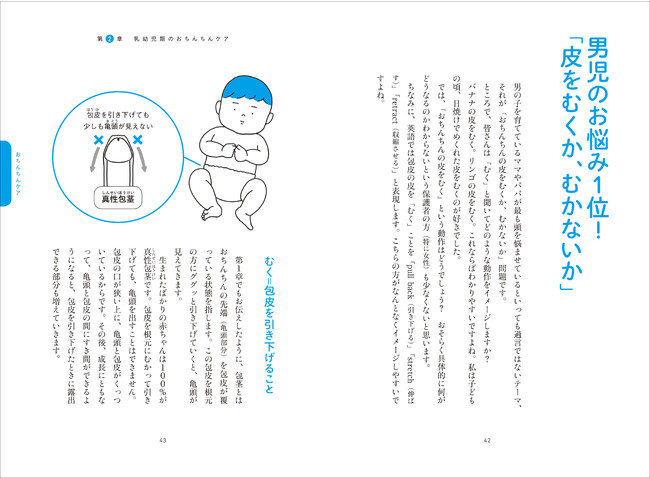 おちんちんの構造や働き、日常のケア、やりがちなNG例、トイレトレーニング法、本当に気をつけなければいけないトラブル例など、基礎的なことから具体的な実践方法まで、イラスト付きで深く掘り下げています。