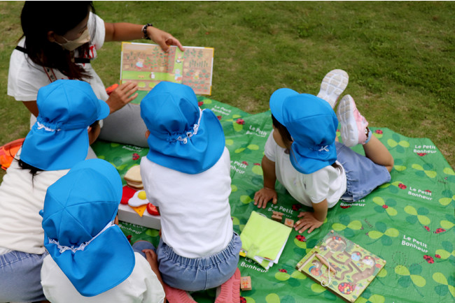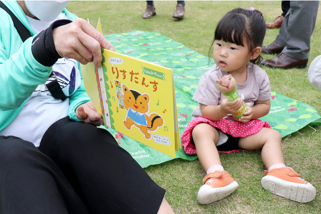 今回の絵本のふれあい体験イベントには、潮見幼稚園の年長組園児と、近隣にお住いの未就園児親子が参加してくれました。天気にも恵まれ、芝生にレジャーシートを敷いて、春を感じさせる温かな日差しを浴びながら気持ちよくイベントを行うことができました。
