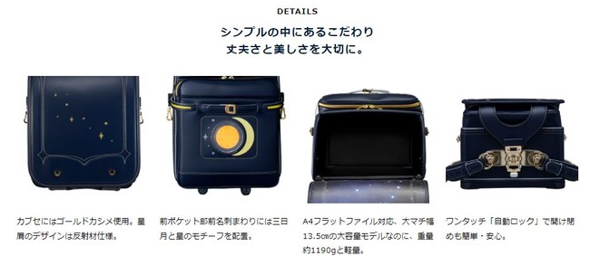 月の満ち欠けには成長という象徴があります。モチーフは満ち欠け途中の三日月です。夜の暗闇を温かい月の光で照らし、子供たちの成長を優しく見守りたい。そんな気持ちをこのランドセルにこめています。