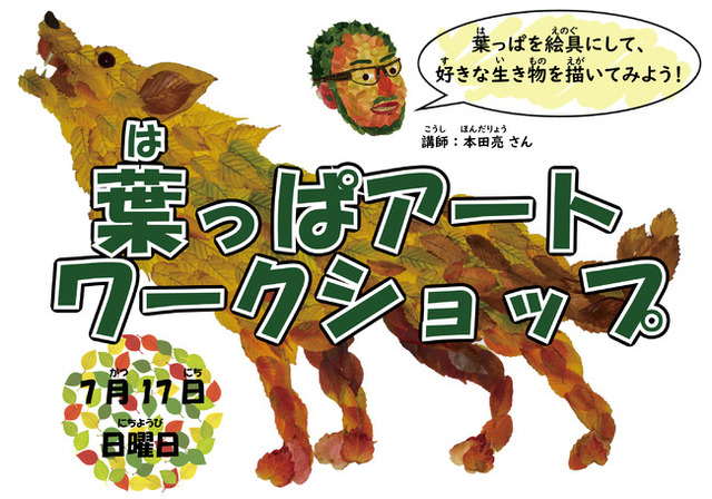 角川武蔵野ミュージアム4階「荒俣ワンダー秘宝館」にて展示中の《葉っぱでアート》。こちらは、様々な葉っぱを並べて動物や昆虫、魚などを作るアート作品です。今回、作家の本田亮氏を講師に迎え、小学生と一緒に自由な発想で葉っぱを使い絵を描く「葉っぱアートワークショップ」を開催します。