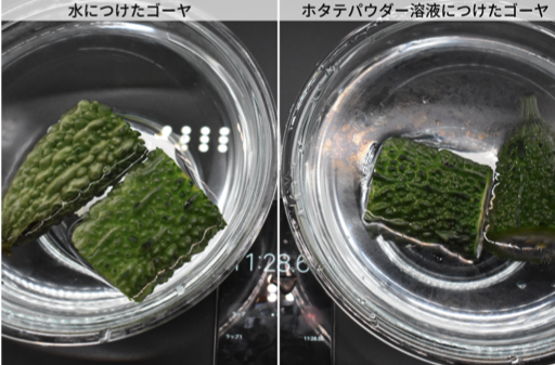 本イベントでは、野菜を水とホタテパウダー溶液に浸し、不純物等の剥離比較も行いました。イベント参加者からは「こんなに汚れが浮き出るのか」「野菜の農薬が気になっていたのでぜひ使ってみたい」など、驚きや喜びの声が出ました。